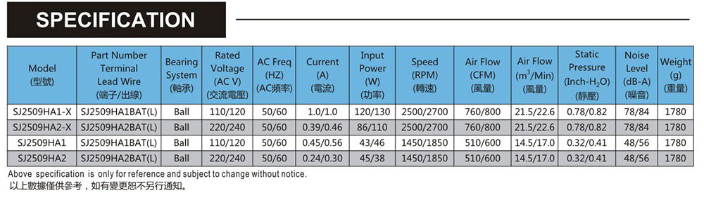 尺寸:254x89mm 框架:鋁ADC-12 軸承:雙滾珠軸承 電壓:AC 110V 220V 380V 壽命:60 000Hours at 20℃--滾珠軸承 工作溫度:-20℃~70℃ 正常濕度 儲存溫度:-20℃~85℃ 正常濕度