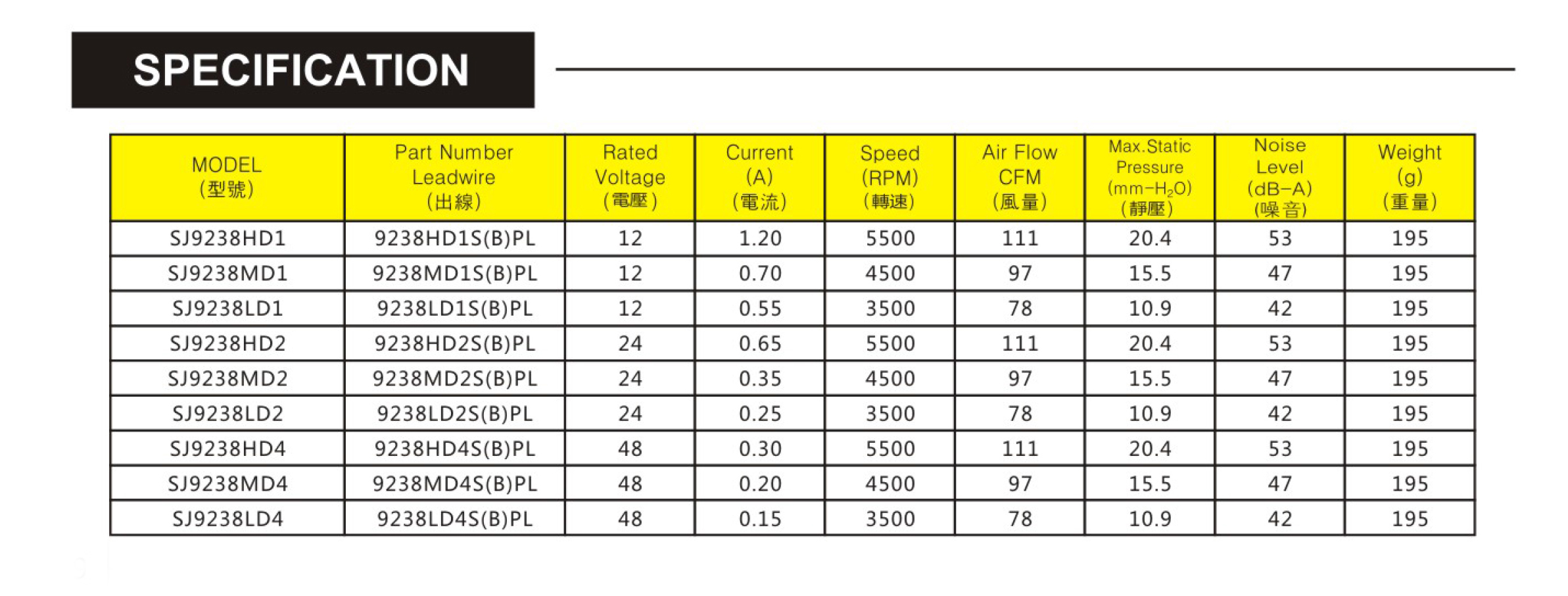 尺寸:92x92x38mm 框架: UL94V-0 PBT 軸承: 含油軸承& 雙滾珠軸承 電壓:DC 5V 12V 24V 48V 壽命:50 000Hours at 25℃--滾珠軸承 30 000Hours at 25℃--含油軸承 工作溫度:-20℃~70℃ 正常濕度 儲存溫度:-20℃~85℃ 正常濕度