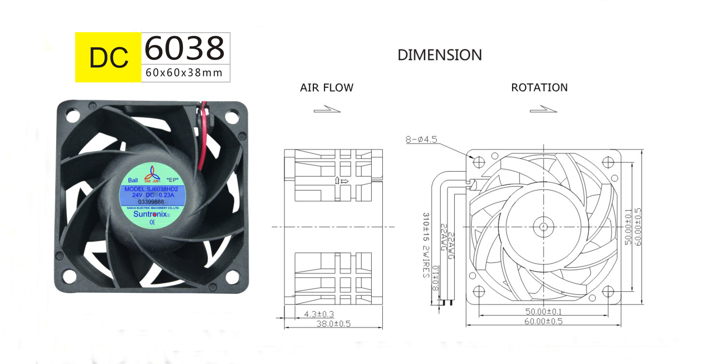 尺寸:60x60x38mm 框架: UL94V-0 PBT 軸承: 含油軸承& 雙滾珠軸承 電壓:DC 5V 12V 24V 48V 壽命:50 000Hours at 25℃--滾珠軸承 30 000Hours at 25℃--含油軸承 工作溫度:-20℃~70℃ 正常濕度 儲存溫度:-20℃~85℃ 正常濕度